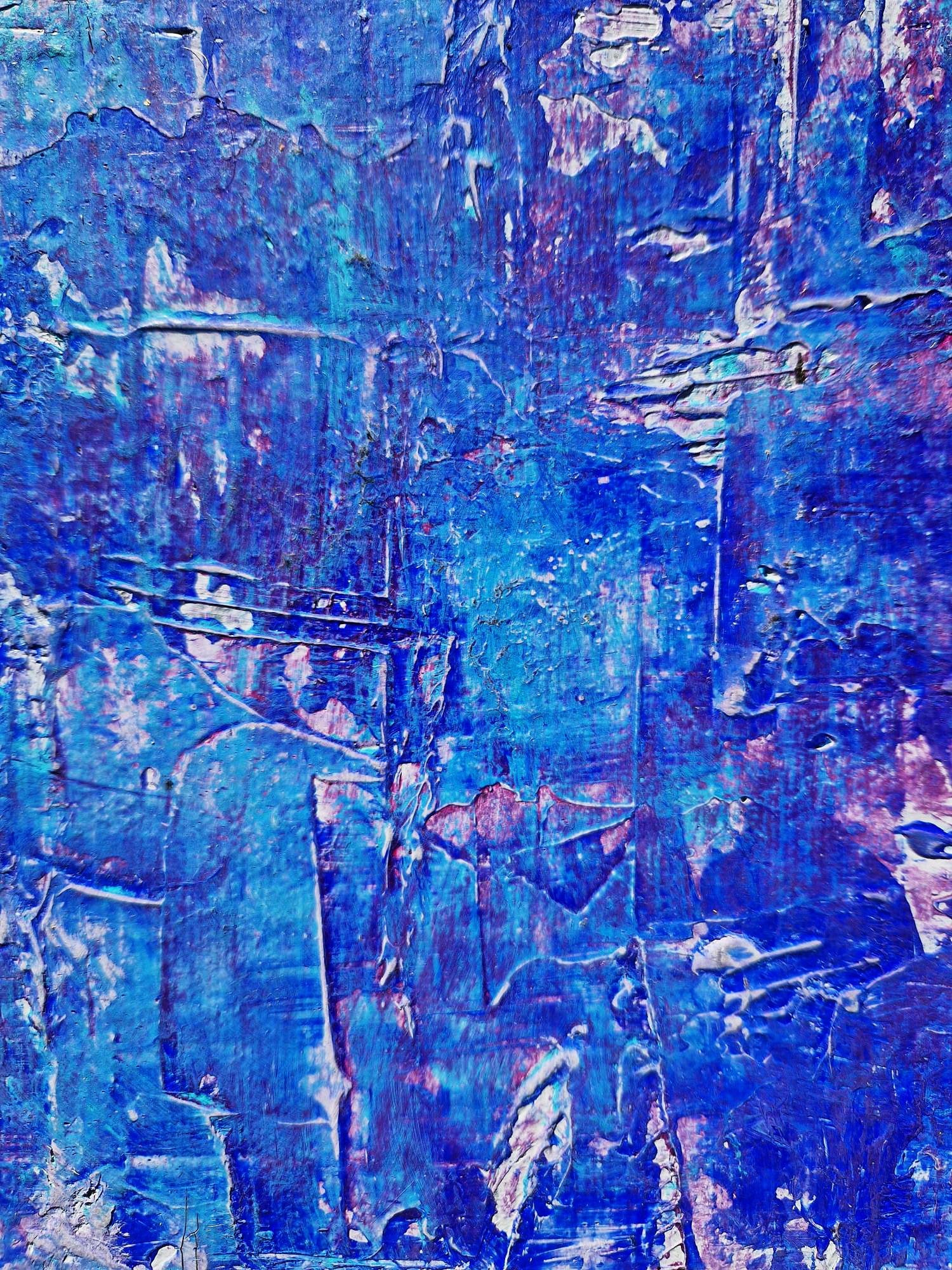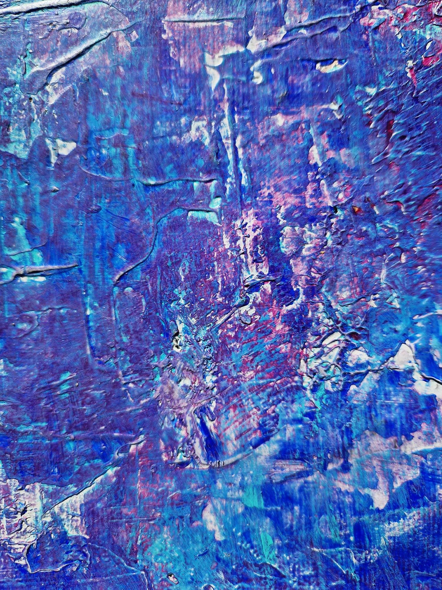 Moving away from earth tones, "Wonderland" explores a dreamlike palette of deep blues, purples, and soft whites. The artist invites the viewer to get lost in its complex layers, where every glance reveals new forms—reminiscent of cosmic nebulae or frozen landscapes.