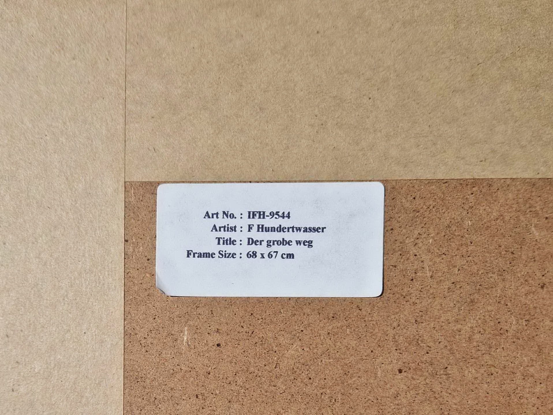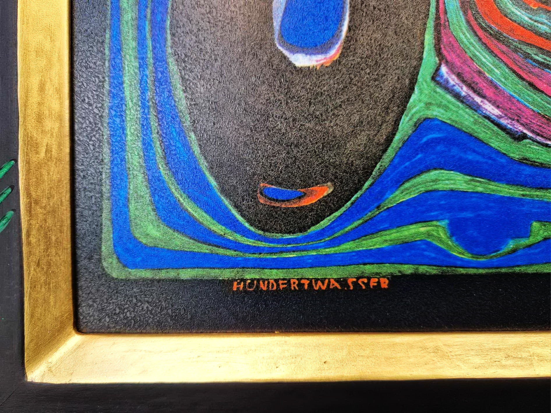 The artwork is perfectly integrated into a bespoke, hand-painted frame that follows Hundertwasser’s organic aesthetic.