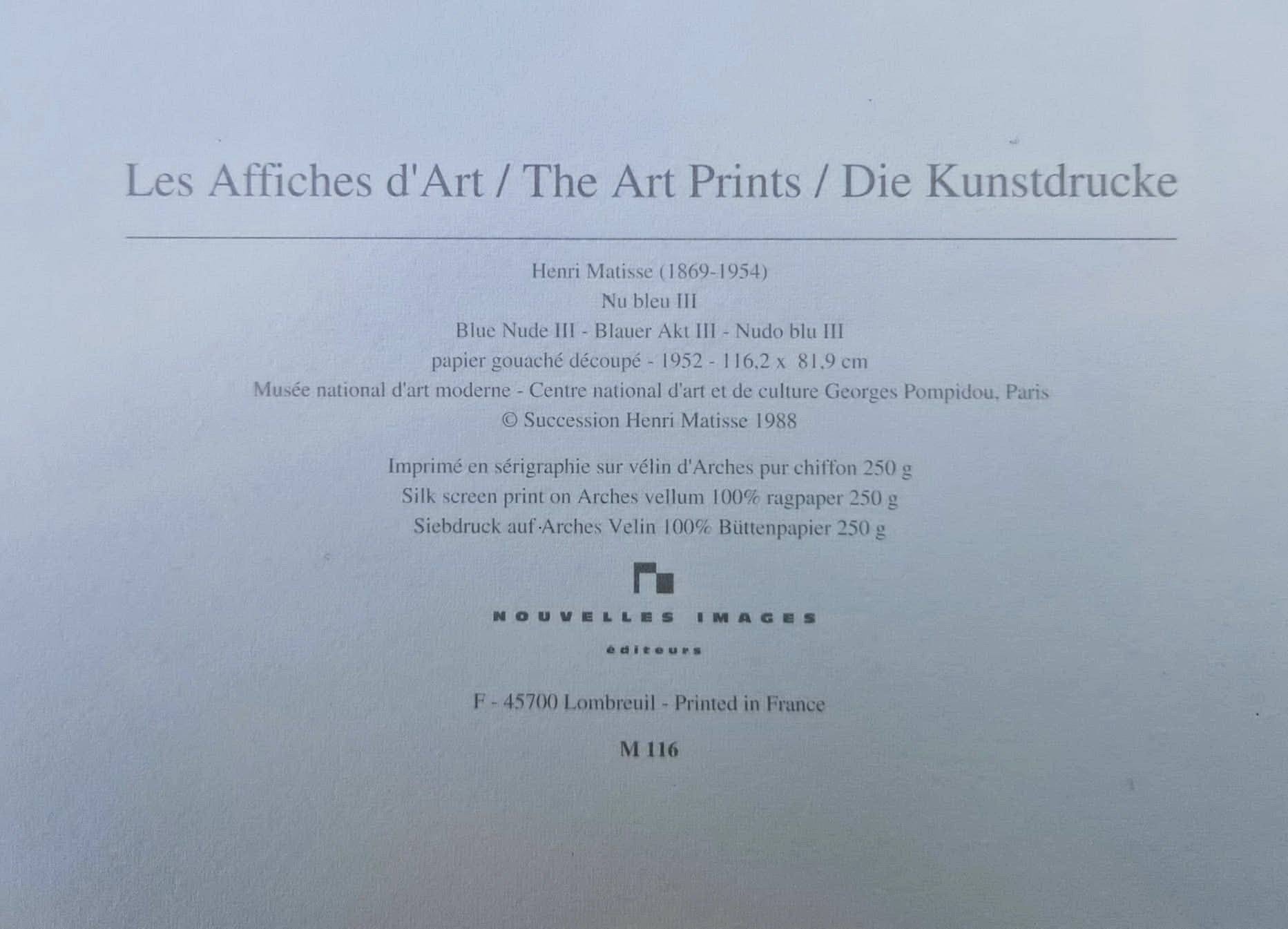 These prints were published by Nouvelles Images (Printed in France) with copyright dates typically around the mid-1990s by the Succession Henri Matisse. They are printed on substantial Arches vellum 100% rag paper (250 g), ensuring high material quality.