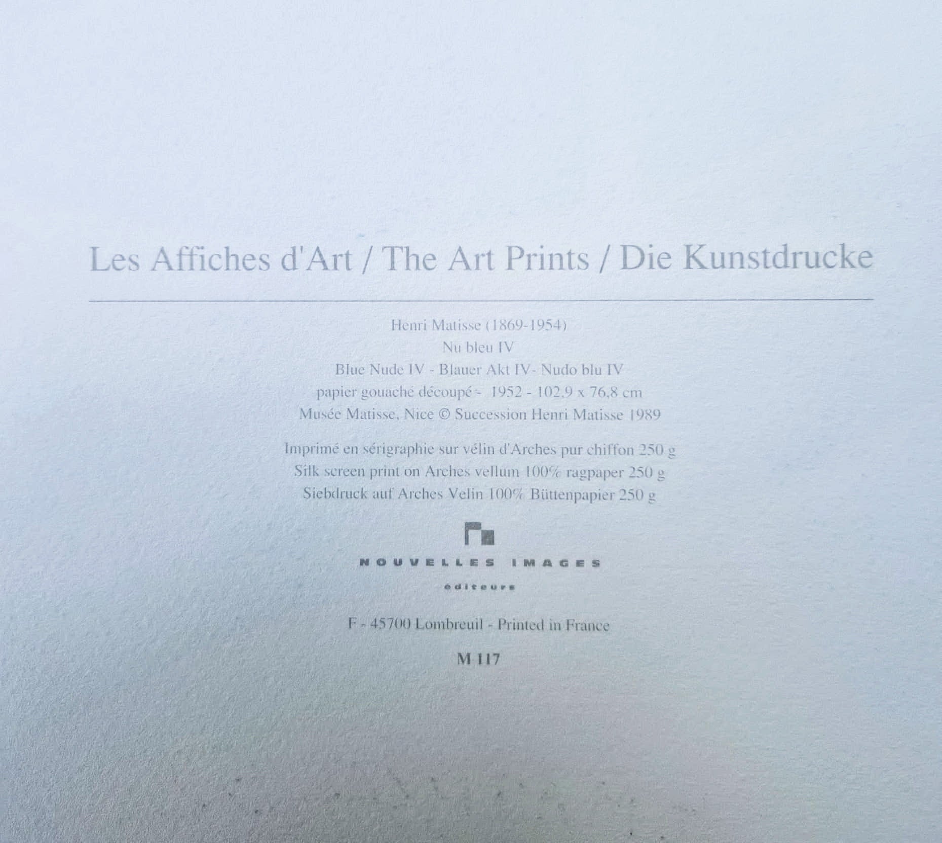 These prints were published by Nouvelles Images (Printed in France) with copyright dates typically around the mid-1990s by the Succession Henri Matisse. They are printed on substantial Arches vellum 100% rag paper (250 g), ensuring high material quality.