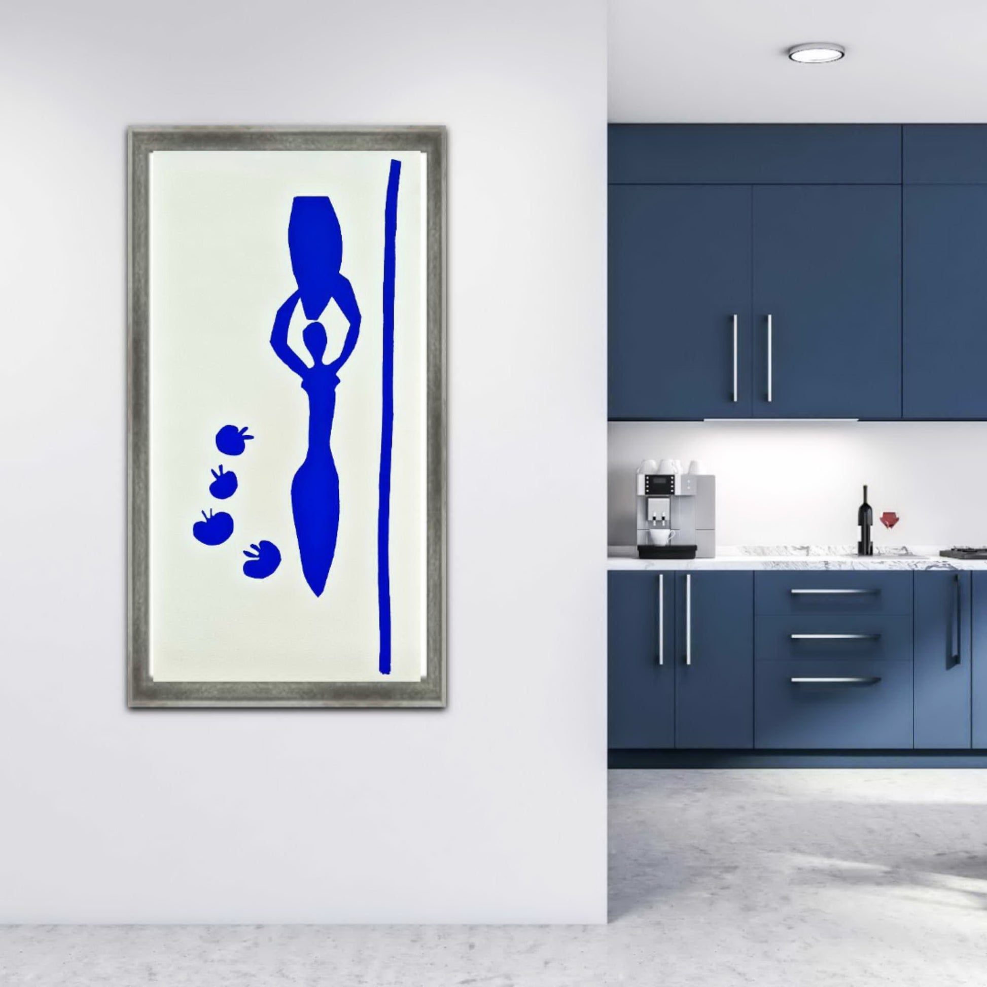 The original artwork for Femme à l'amphore et grenades was created by Henri Matisse in 1952 using his revolutionary late-life technique he called "drawing with scissors" (dessin aux ciseaux). This method involved cutting figures and shapes directly from large sheets of paper previously painted with vibrant gouache paints. This technique allowed him to unify line, colour, and form in a uniquely direct way.