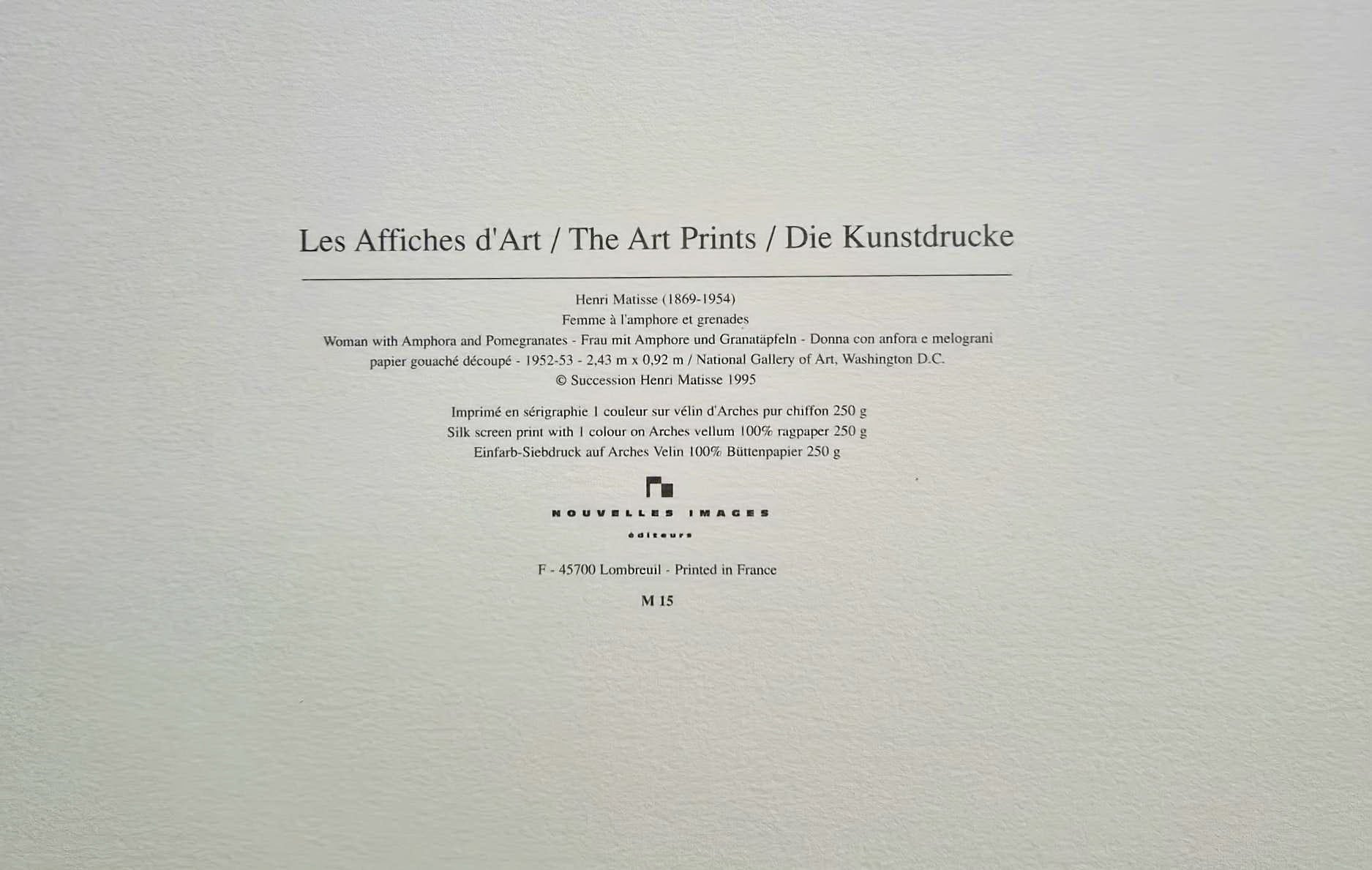 This print was published by Nouvelles Images (F-45700 Lombreuil, Printed in France) with a copyright date of 1995 by the Succession Henri Matisse. It is printed in one colour on substantial Arches vellum 100% rag paper (250 g), ensuring high material quality.