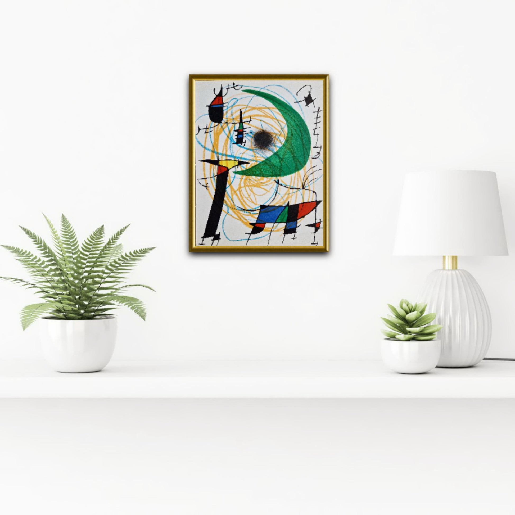 Miró was motivated by the raw energy of celestial bodies and universal symbols. In this composition (Plate V), the dominant green crescent moon acts as a spiritual anchor for a dance of "creatures of the universe." The energetic yellow swirls and bold, organic black lines create a poetic dialogue between the sky and the subconscious, typical of Miró’s unique brand of surrealist abstraction.