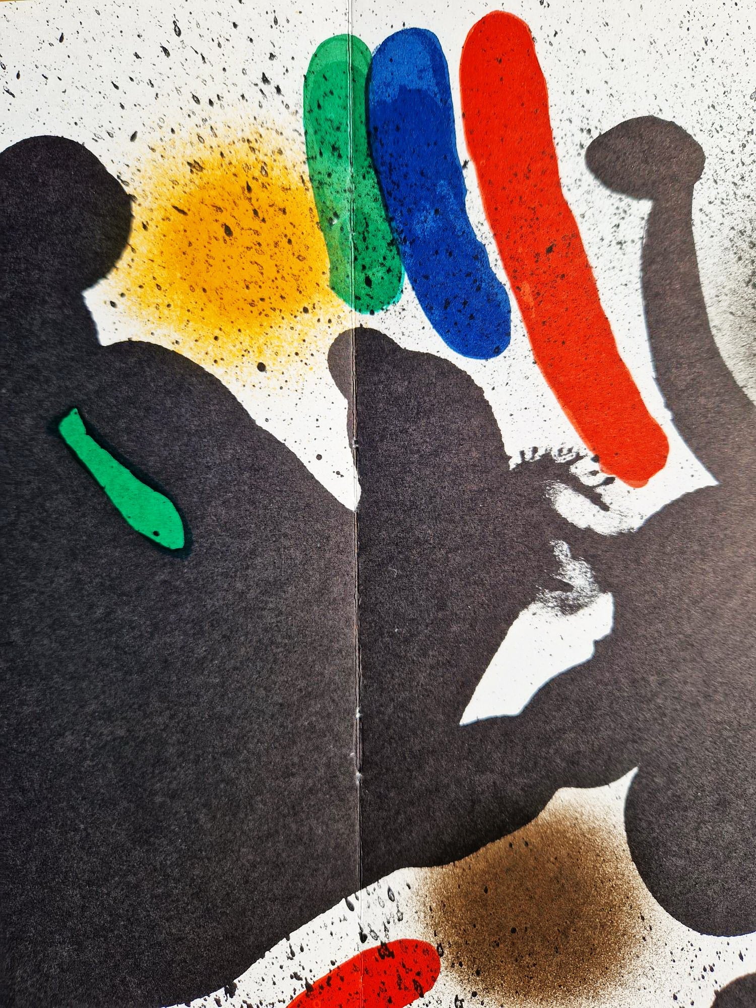 This original work showcases the exceptional ink saturation and textural depth that only the master printers at Mourlot could achieve. Printed on high-quality archival paper, it features the authentic centerfold as published, preserving its history as a centerpiece from the prestigious Miró Lithographe I portfolio.