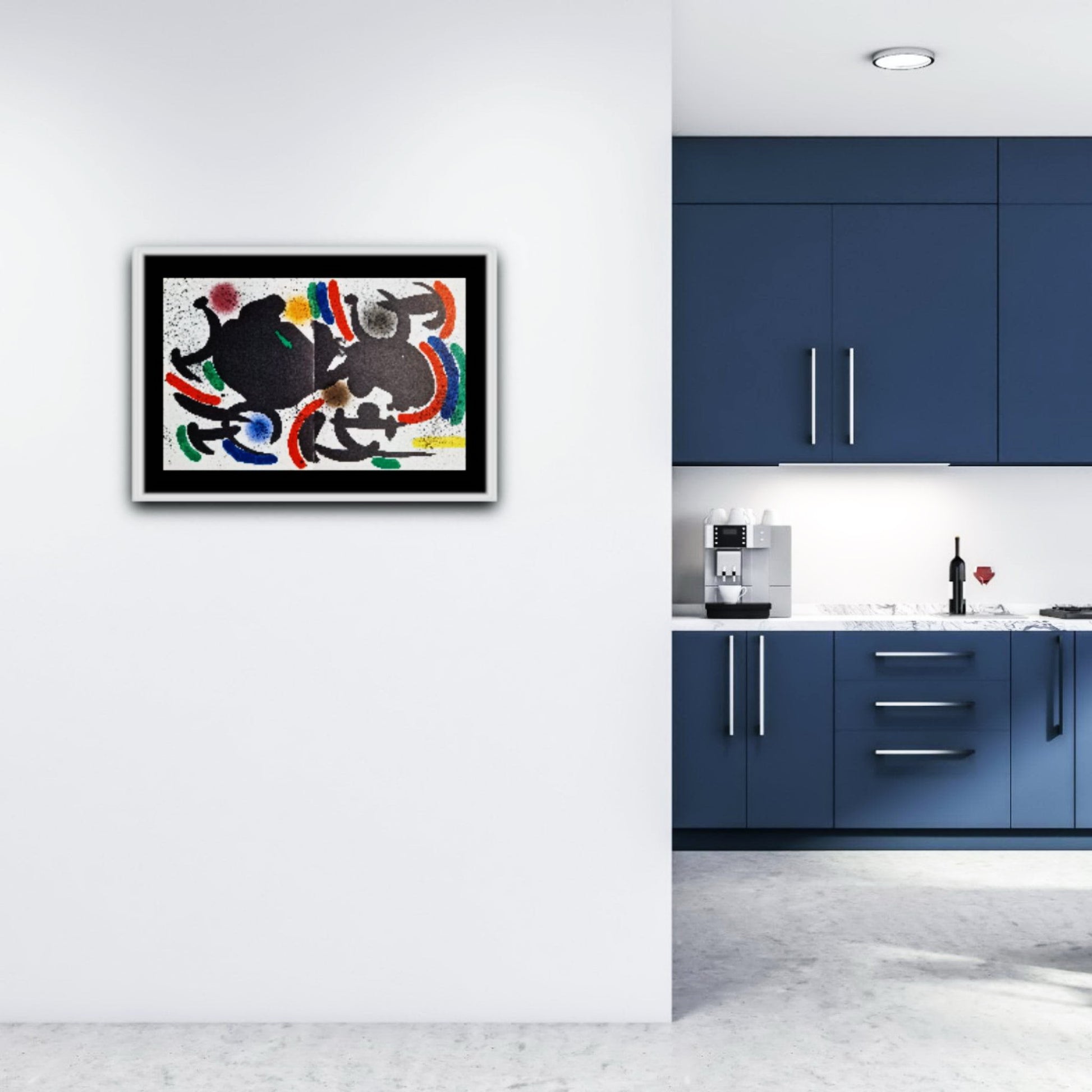 Miró was motivated by the spontaneous energy of the subconscious. In this composition, he constructs a poetic universe where bold, organic black silhouettes act as architectural anchors for "vibrating" splashes of primary colors—red, blue, yellow, and green. It is an exploration of automatism, where every line and dot represents a rhythmic pulse of a dream.