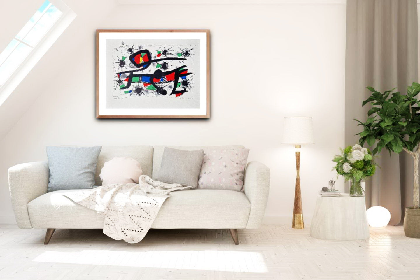 Miró was motivated by the raw, spontaneous energy of the subconscious. In this work, the bold black calligraphic strokes act as a rhythmic skeleton for a constellation of primary colors—vivid red, deep blue, and radiant yellow. The surrounding "starbursts" and splatters reflect the artist's use of automatism, where symbols are not just shapes, but a secret language of stars and dreams.
