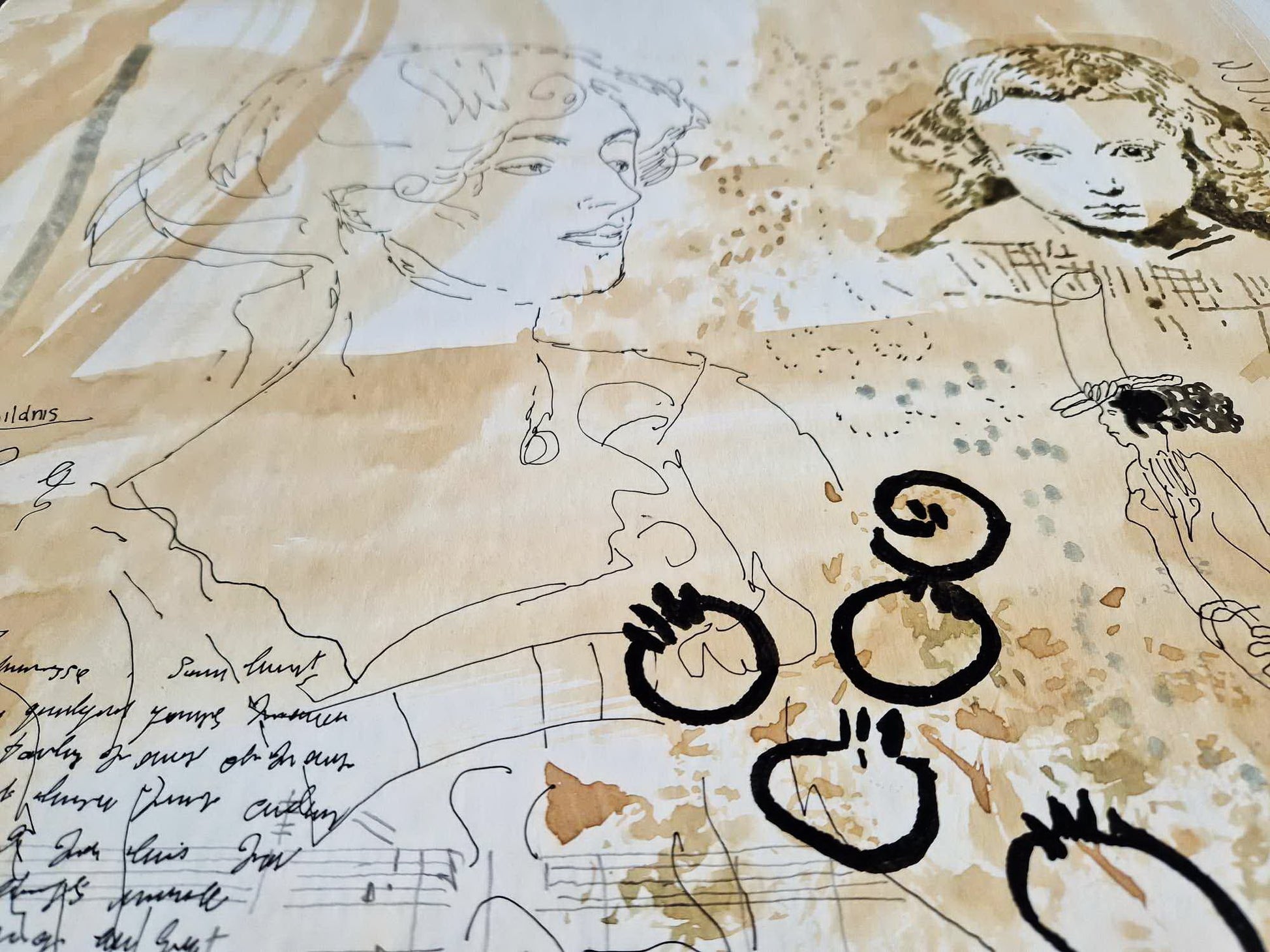 The composition is a visceral dialogue between bold watercolor washes in warm sepia tones and delicate, sophisticated ink sketches. The central portraits of the women reflect Eisemann's obsession with classical beauty, while the surrounding handwritten-style notes and playful figures create a deeply personal, "diary-like" narrative.