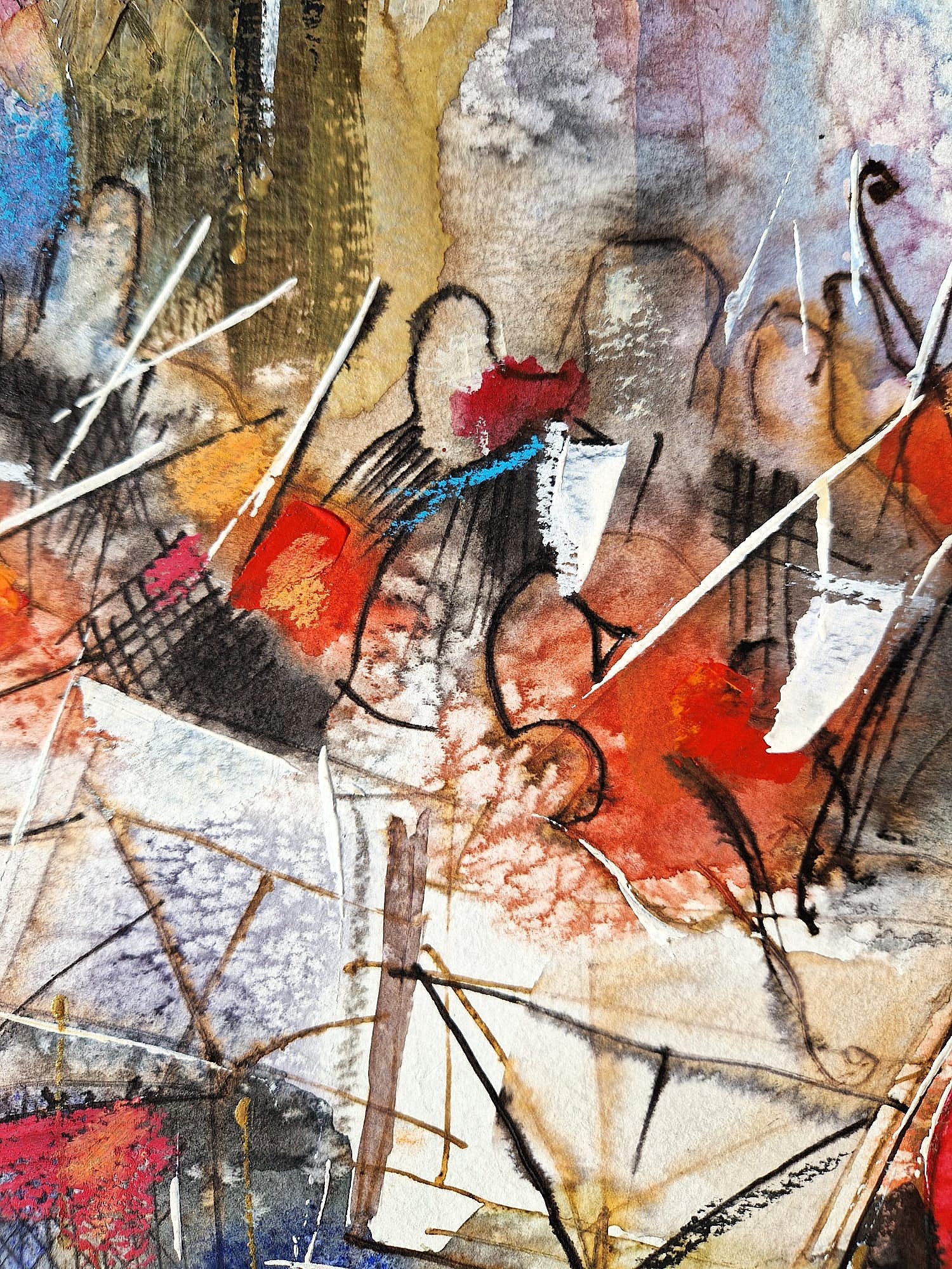 "A Hidden Beautiful Spectator" is a breathtaking original watercolor masterpiece by the world-renowned artist Michael Rozenvain. This one-of-a-kind work captures the rhythmic soul and vibrant energy of an orchestral performance in Rozenvain's signature modern impressionist style.