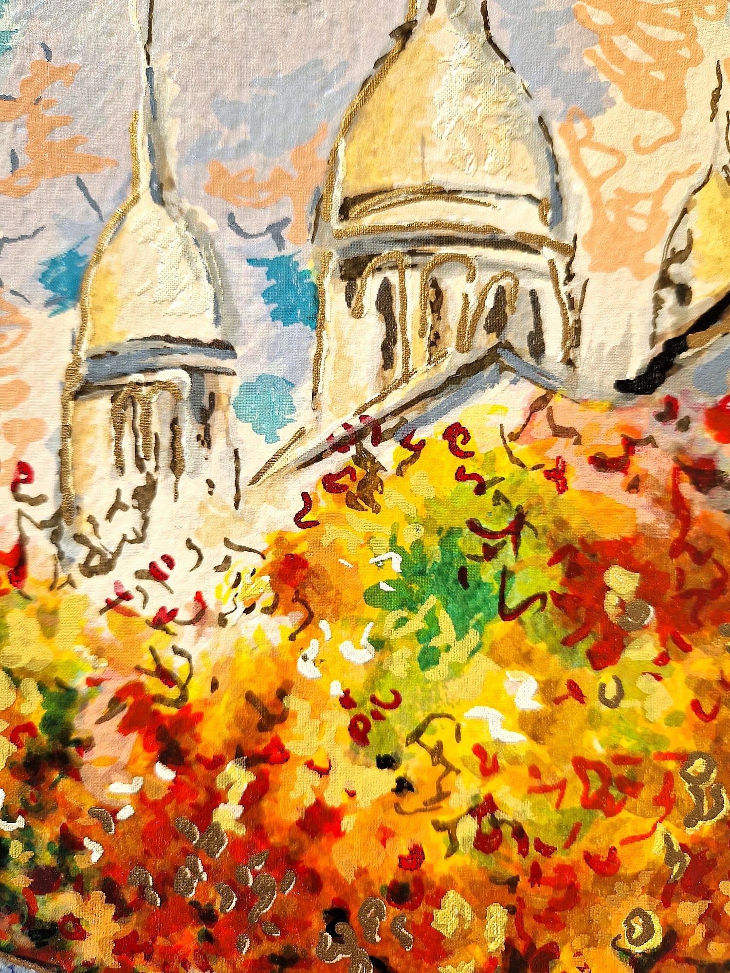 "Artistic Plaza" is a masterful tribute to the romantic heart of Paris—the historic Place du Tertre in Montmartre. In this vibrant composition, the majestic white domes of the Sacré-Cœur Basilica rise above a lively square filled with artists' easels and glowing autumn trees.