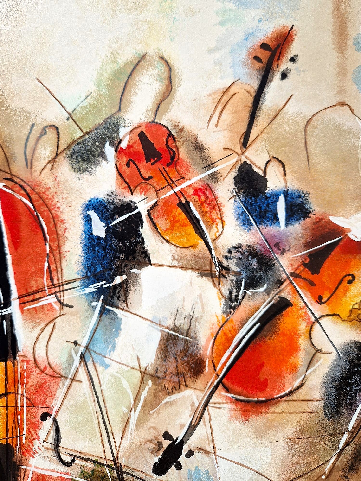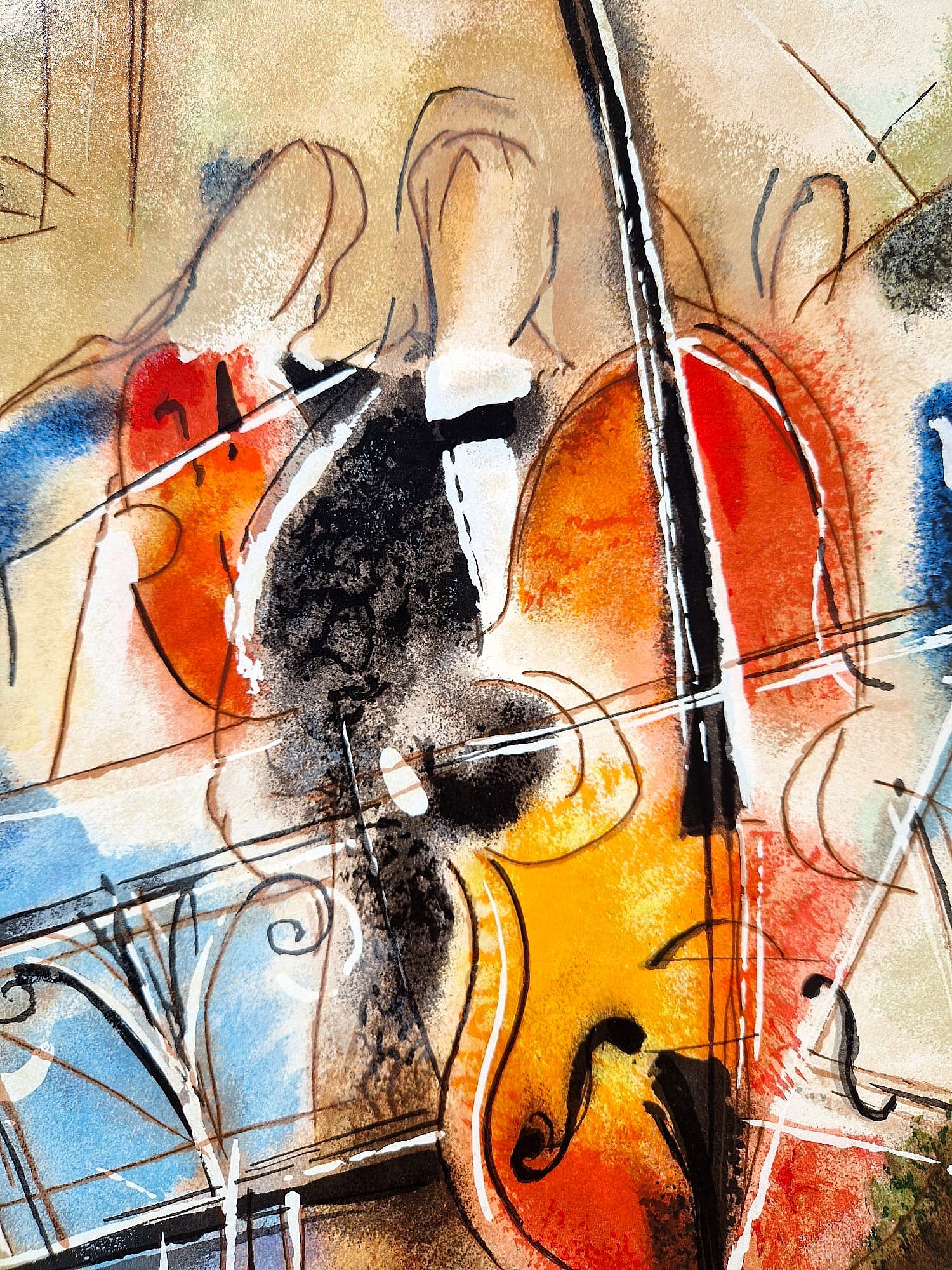 Each subtle hue and fine line in this musical scene was applied individually through fine silk mesh screens. This labor-intensive manual process gives the colors a tangible physical presence, mimicking the impasto and emotional resonance of a live performance.