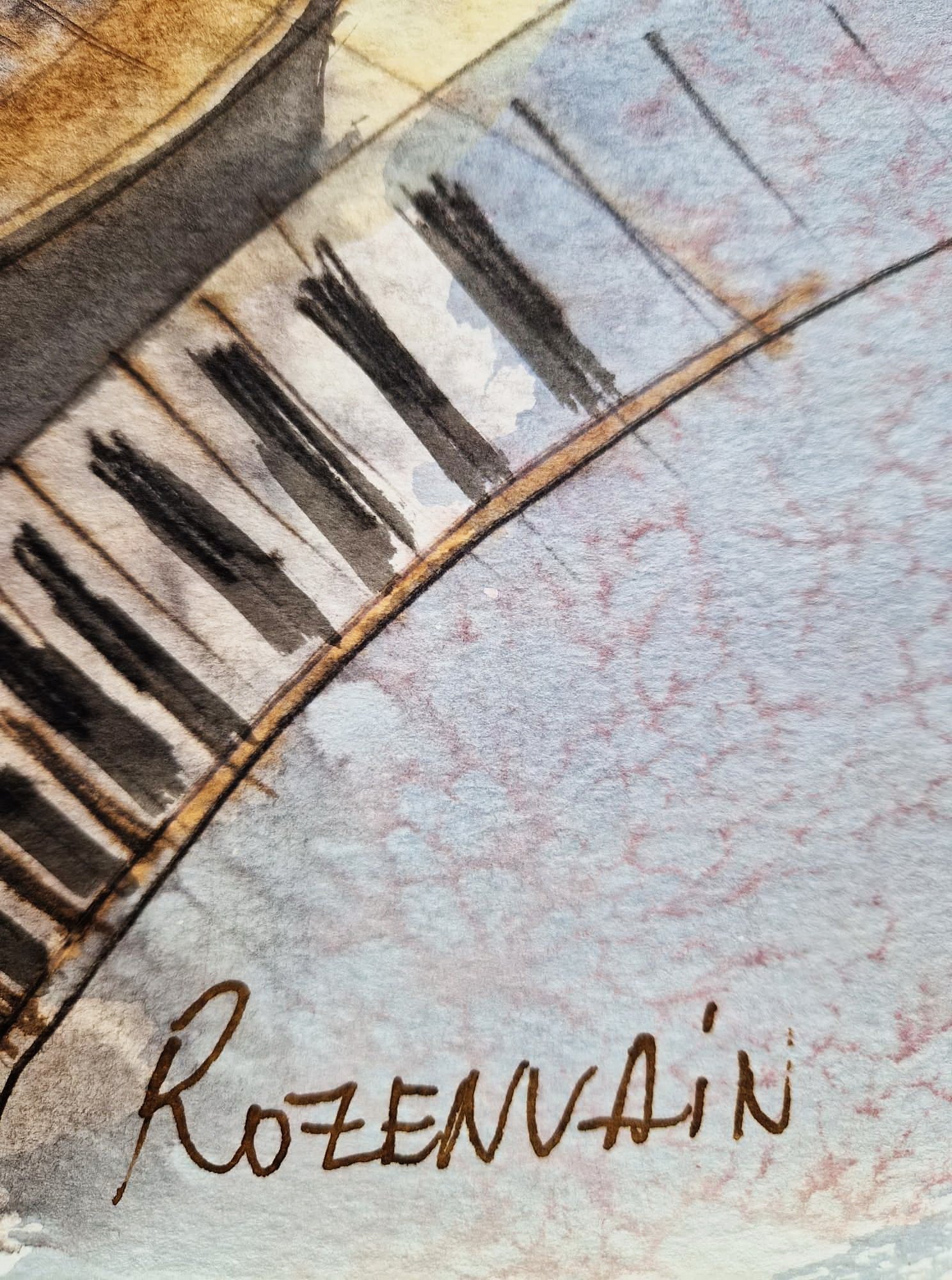 This piece is more than a painting; it is a "palimpsest of sound." Rozenvain builds the composition through layers of fluid watercolor wash, where the musicians and their instruments (violins, cello, and grand piano) seem to emerge from the music itself. The prominent "MOZART" inscription serves as a tribute to the classical heritage that inspires the artist's modern impressionist vision.