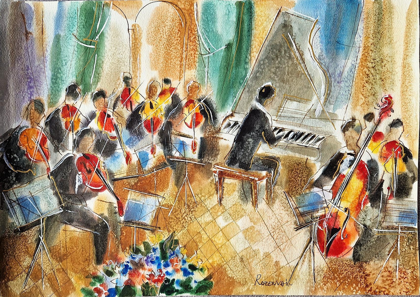 The artist was motivated by the vibrancy of sound and light. In this composition, the rhythmic energy of the orchestra is mirrored by an explosion of flowers in the foreground. It is a visual celebration where the "pulse" of the music merges with the organic beauty of life, creating a sensory experience that goes beyond a standard performance.