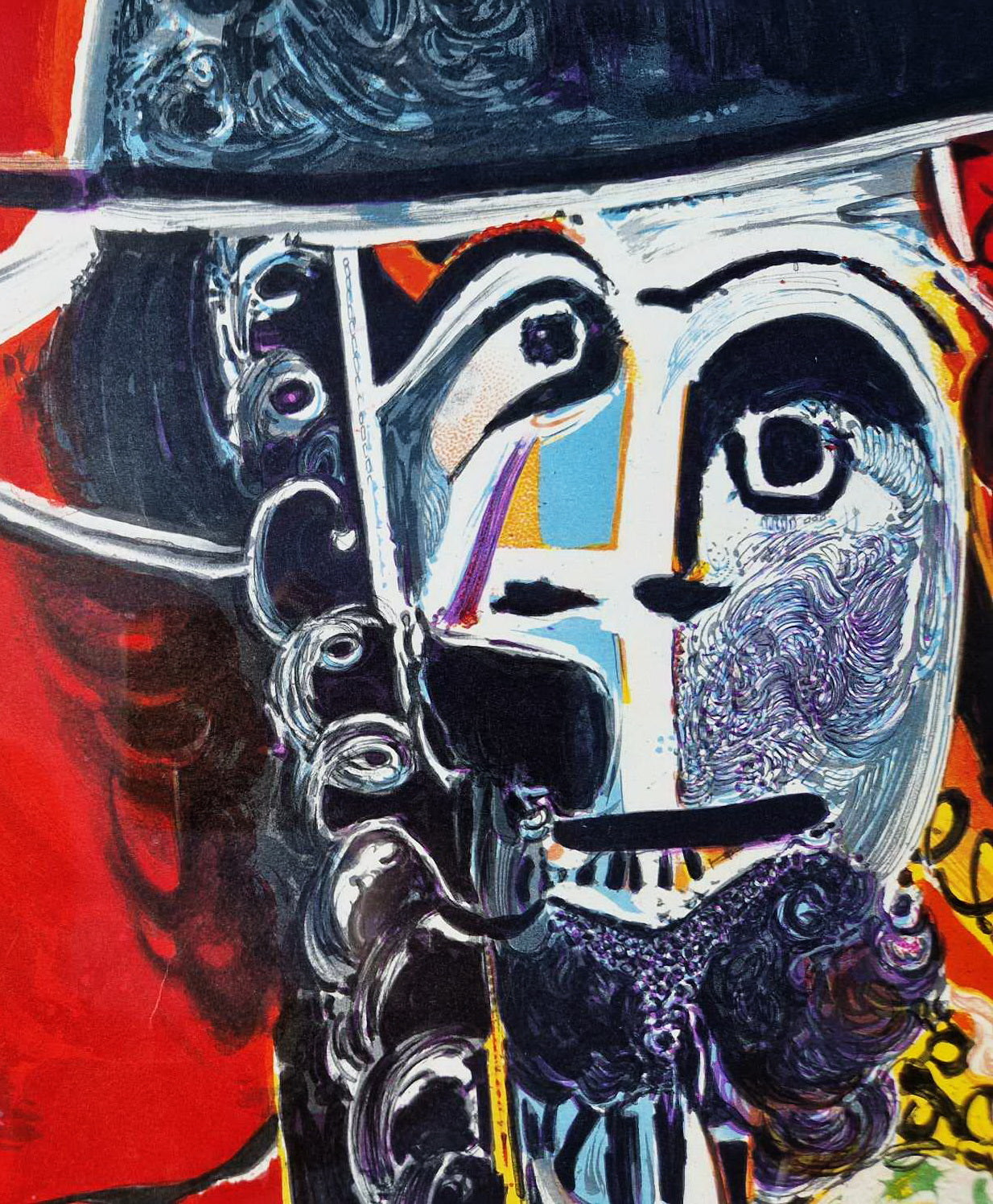 The artwork features Picasso’s 1969 oil masterpiece "Homme à l’épée" (Man with a Sword), also known as The Corsair. It is a fierce, energetic depiction reflecting the artist’s undiminished passion at the age of 88.