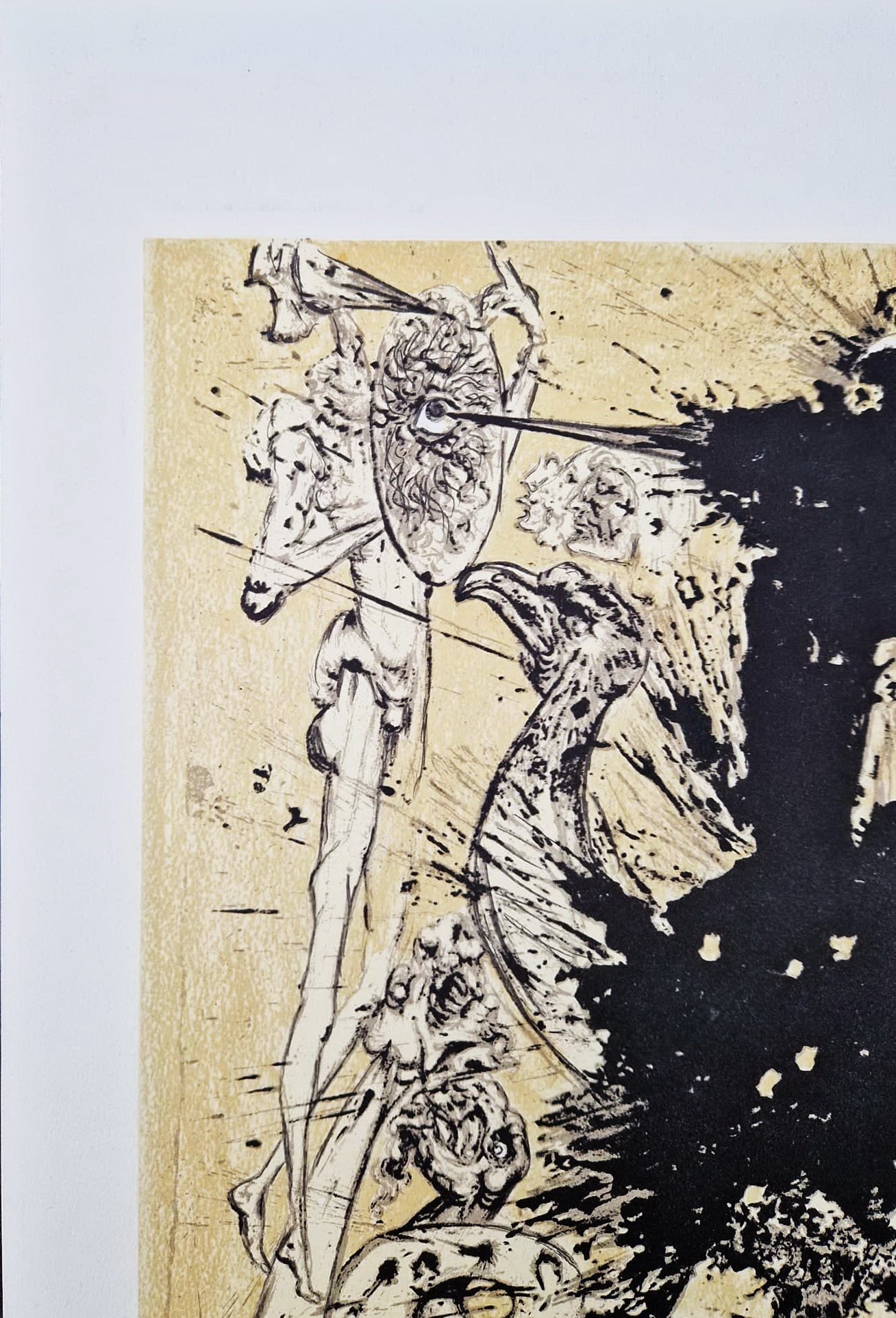 Instead of traditional drawing on the litho stone, Dalí famously utilized an air gun filled with lithographic ink, firing it directly onto the plate to create the explosive, splattered effects seen in the main black form. He also incorporated other elements of chance and spontaneity, such as dipping snails in ink and allowing them to crawl across the printing surface, leaving organic, swirling traces that form some of the intricate line-work. This innovative method perfectly merges his surrealist paranoiac-critical vision with the literary classic.