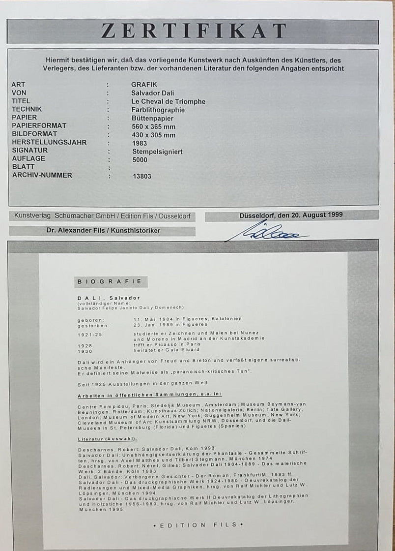 The horse was a recurring and powerful symbol for Dalí, representing a mix of beauty, elegance, strength, and raw, untamed energy, often rooted in mythology and history. Unlike earlier, more experimental graphic works where Dalí was physically drawing on the stone, these lithographs are considered "after Dalí" works. This means they are high-quality reproductions produced under his direct supervision and with his consent during his lifetime, but the signature is "plate-signed" but the signature is "imprinted directly on the paper as part of the print", not hand-penciled.