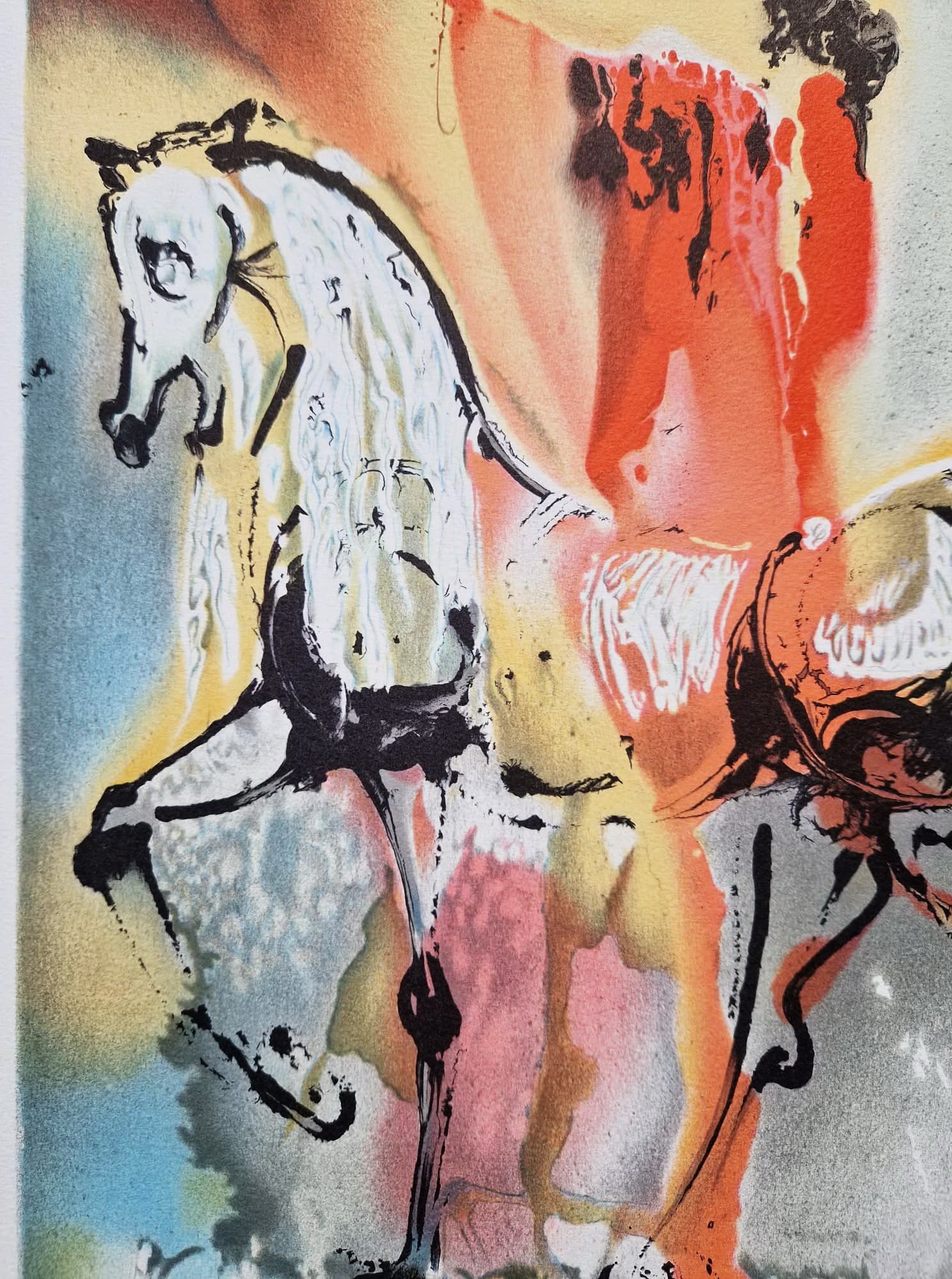 The horse was a recurring and powerful symbol for Dalí, representing a mix of beauty, elegance, strength, and raw, untamed energy, often rooted in mythology and history. Unlike earlier, more experimental graphic works where Dalí was physically drawing on the stone, these lithographs are considered "after Dalí" works. This means they are high-quality reproductions produced under his direct supervision and with his consent during his lifetime, but the signature is "plate-signed" but the signature is "imprinted directly on the paper as part of the print", not hand-penciled.