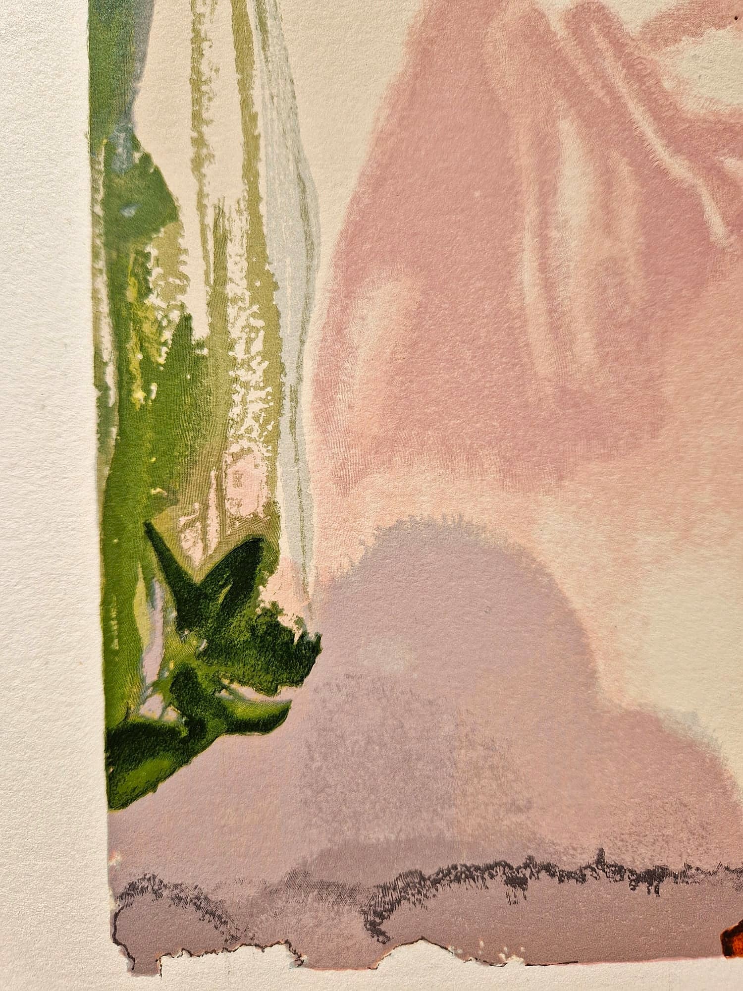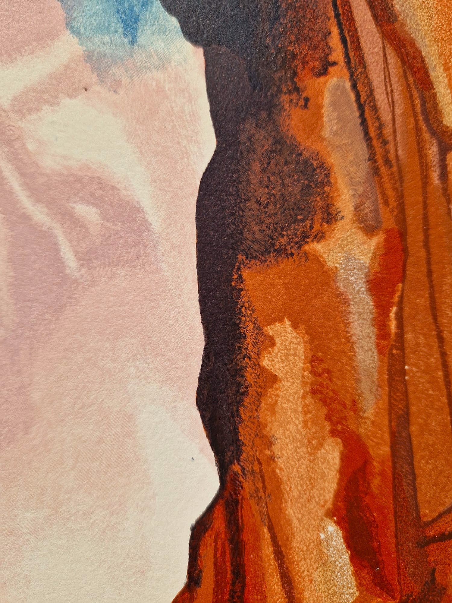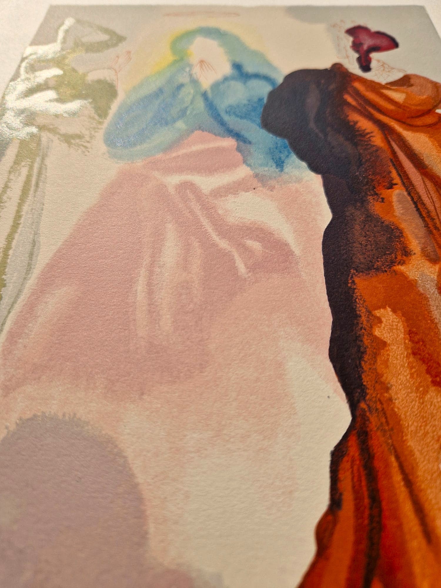 Original color wood engraving by Salvador Dalí from the Divine Comedy (Dante Alighieri) series, created between 1960 and 1964. This work is the result of a monumental project in collaboration with the Parisian publishing house Les Heures Claires. Each illustration was meticulously hand-engraved by master engraver Raymond Jacquet, using an average of 35 separate woodblocks per print to achieve its rich coloration. It remains one of the most significant graphic achievements of the 20th century, merging Dalí’s surrealist vision with the medieval literary classic
