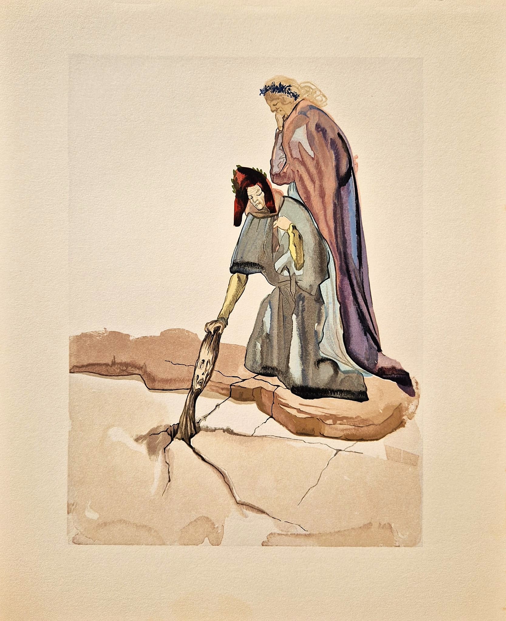 Original color wood engraving by Salvador Dalí from the Divine Comedy (Dante Alighieri) series, created between 1960 and 1964. This work is the result of a monumental project in collaboration with the Parisian publishing house Les Heures Claires. Each illustration was meticulously hand-engraved by master engraver Raymond Jacquet, using an average of 35 separate woodblocks per print to achieve its rich coloration. It remains one of the most significant graphic achievements of the 20th century, merging Dalí’s surrealist vision with the medieval literary classic