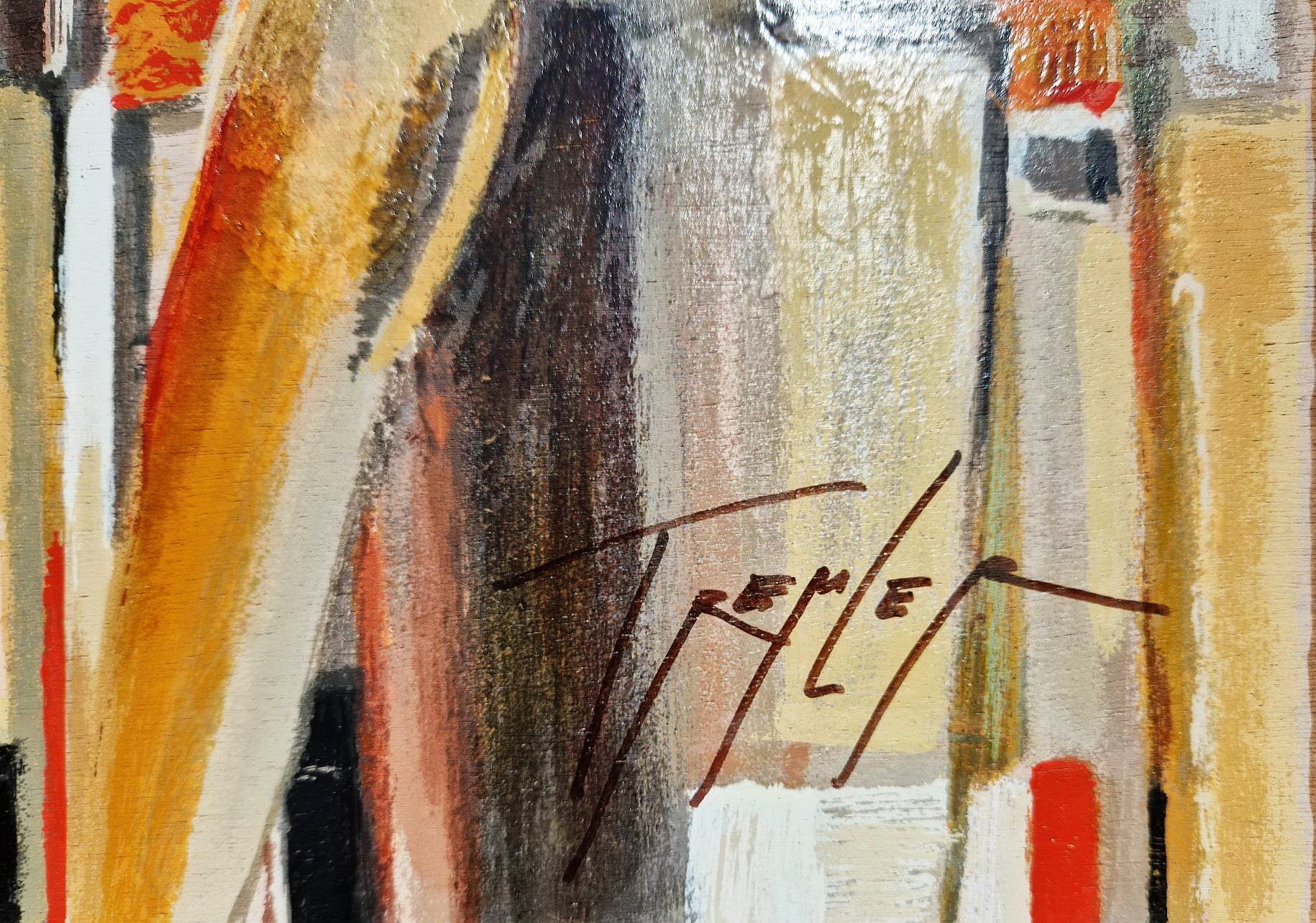 In this unique composition on wood, Tremler explores the atmospheric connection between individuals in an intimate social setting. His motivation was to portray the silhouettes of two elegant women and a waiter or companion as a unified symphony of bohemian elegance. The shimmering ochre and muted gold tones evoke a sense of nostalgic luxury, where the viewer can almost feel the soft buzz of conversation through the hazy, textured background.