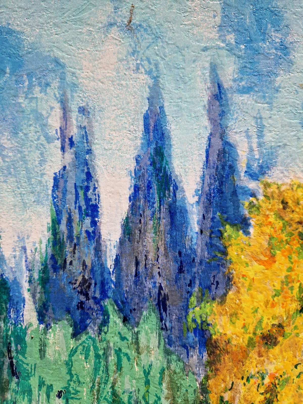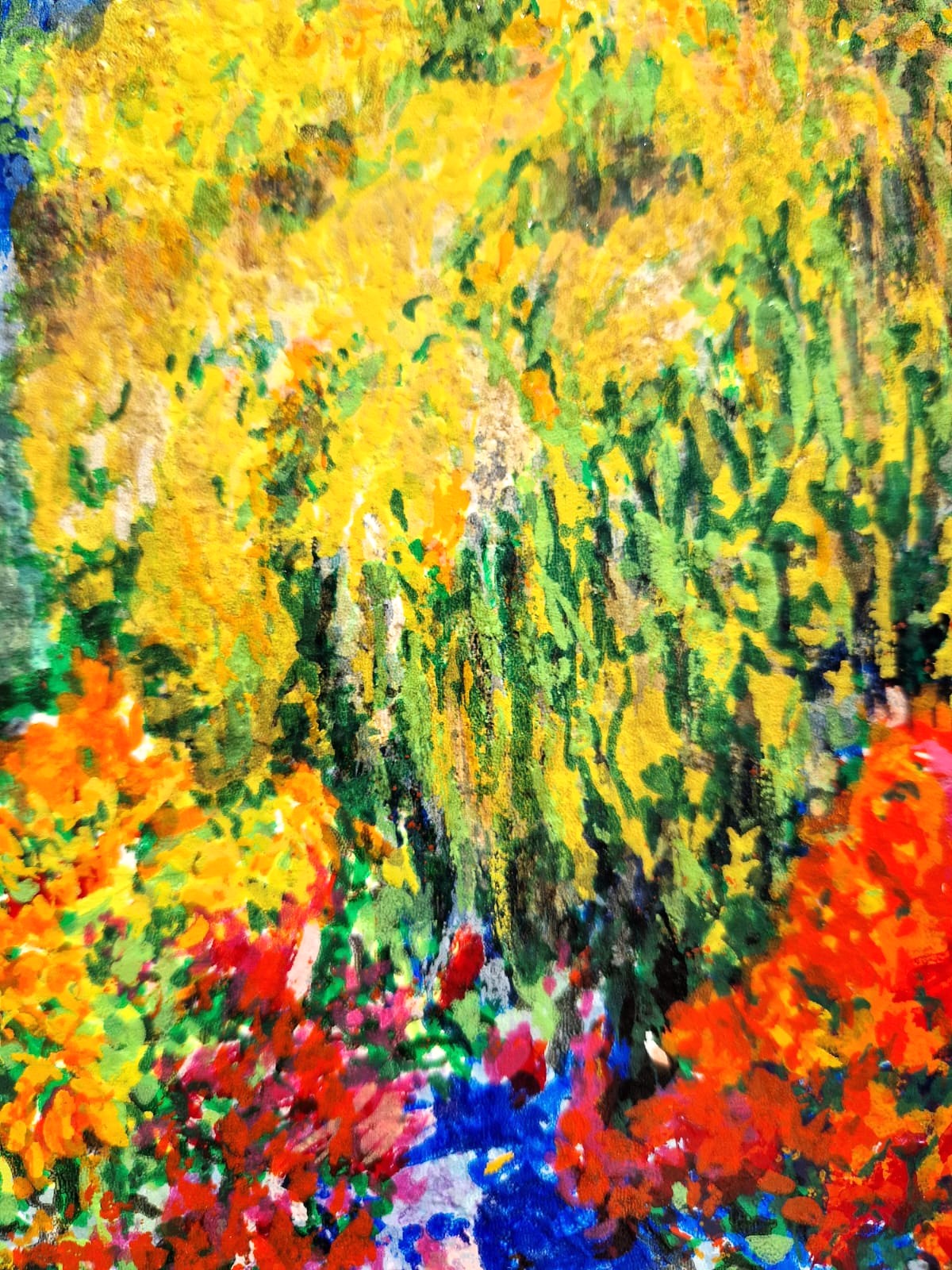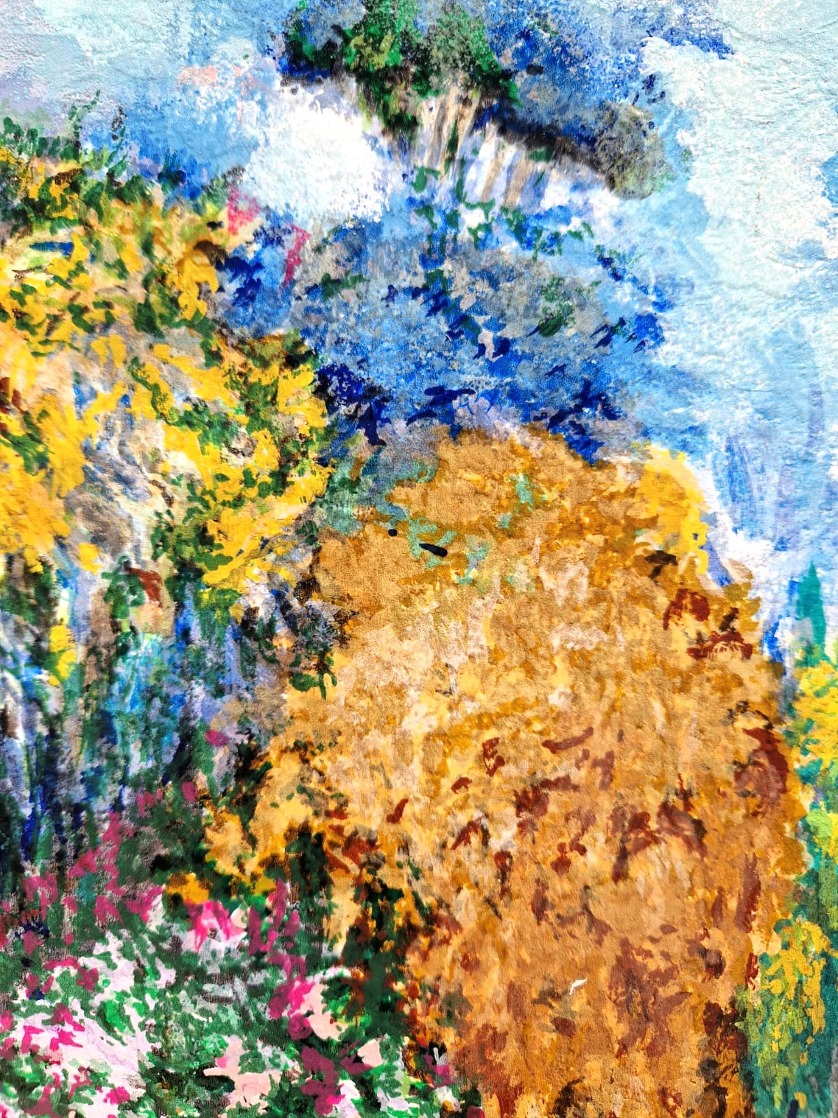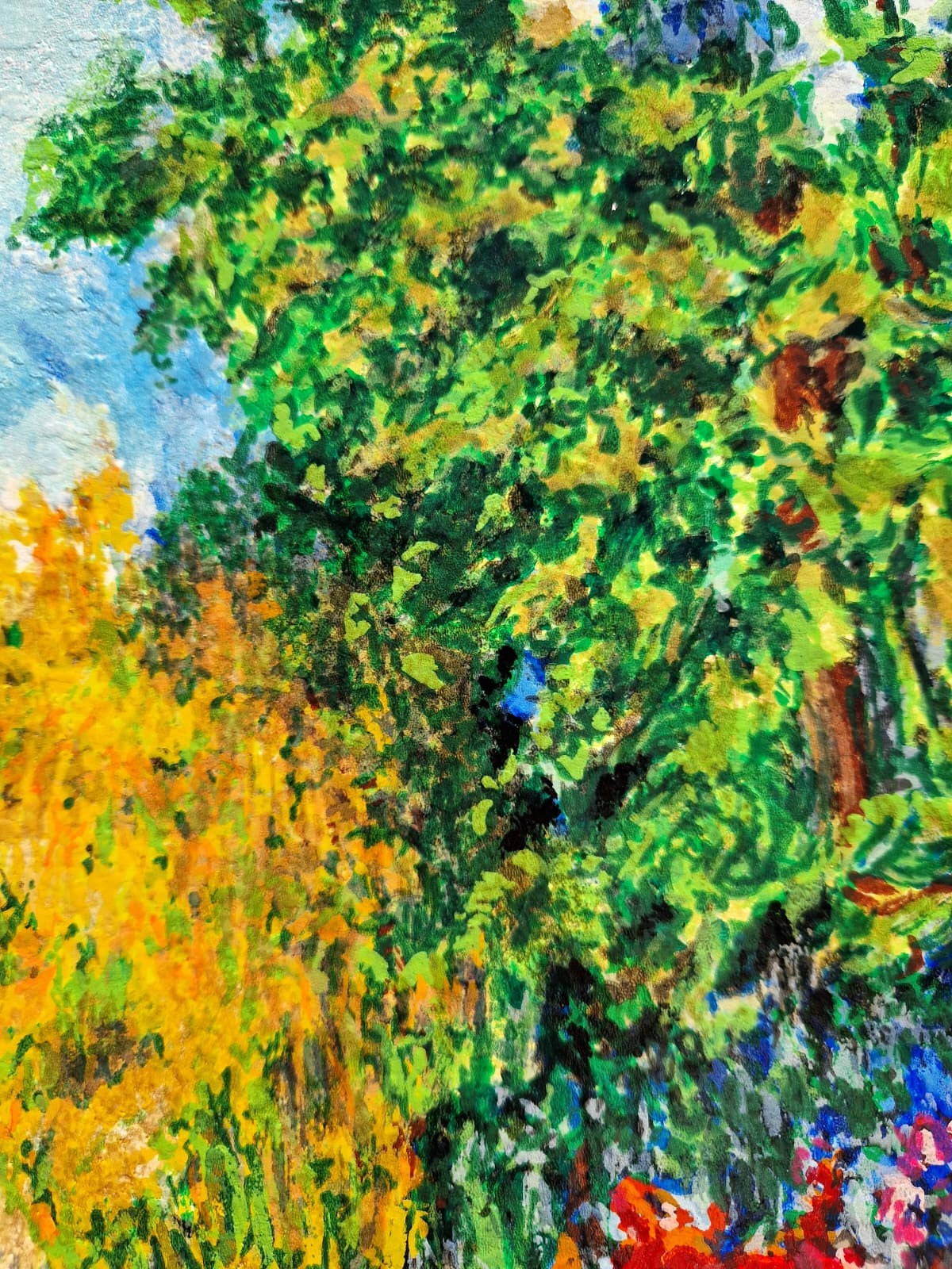 Na rozdiel od jeho statickejších záhradných scén sa toto dielo zameriava na pocit pohybu. Zlatožlté kríky a žiarivá modrá farba vzdialených stromov vytvárajú vizuálnu cestu, ktorá vťahuje diváka hlboko do plátna. Polak prekladá „vibrácie“ letného vánku do expresívnych, textúrovaných vrstiev, vďaka ktorým záhrada pôsobí, akoby dýchala.