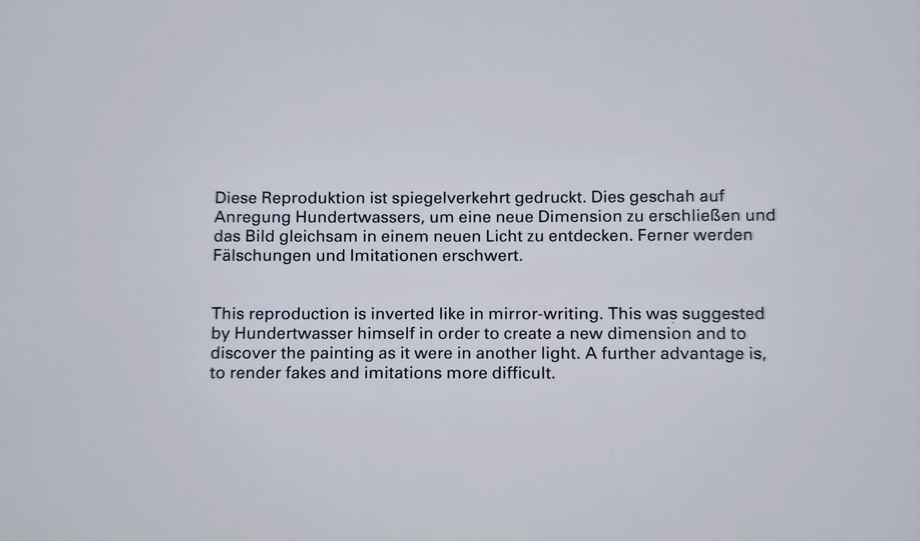 Táto konkrétna reprodukcia „Das 30 Tage Fax Bild“ (dielo č. 936) sa vyznačuje fascinujúcim detailom, ktorý ju odlišuje od štandardných tlačí: je vytlačená zrkadlovým písmom (invertovaná).