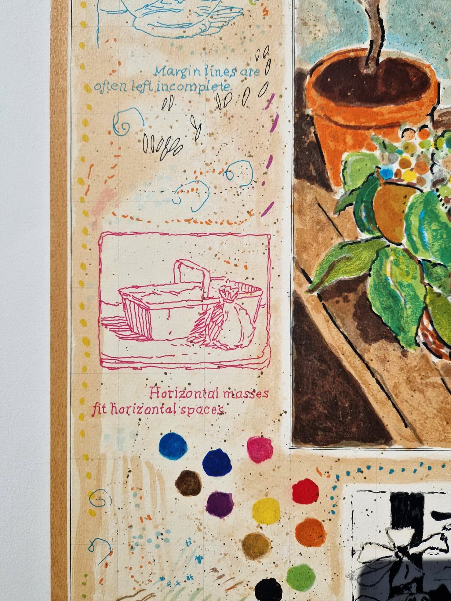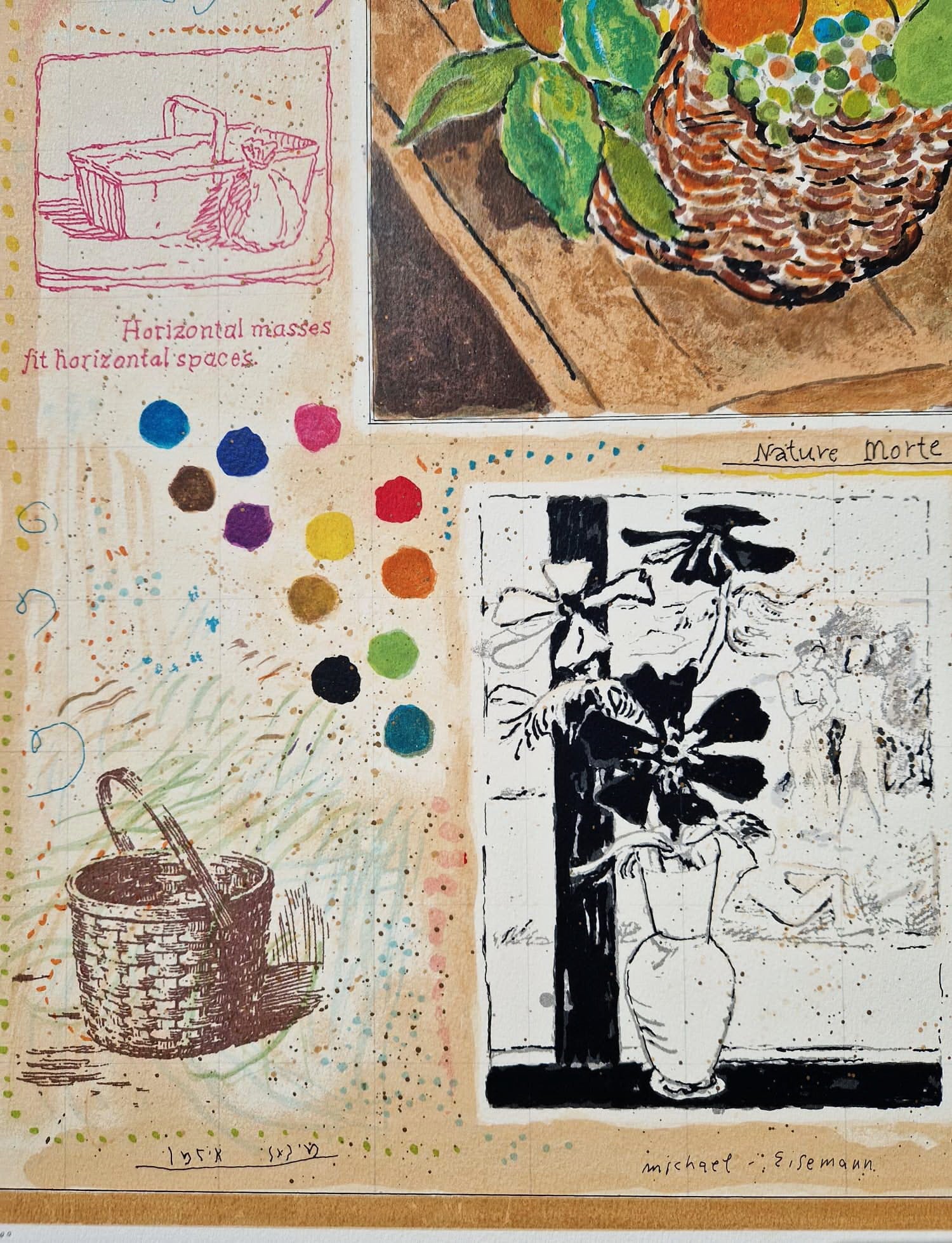Kompozícia sa sústreďuje okolo živého zátišia s bujnou kyticou a slnkom zaliatym košíkom ovocia. Okolo neho sú Eisemannove charakteristické „denníkové“ prvky: náčrt prúteného košíka, pohľad z okna a ručne maľovaná farebná paleta, ktoré premieňajú papier na osobnú svätyňu spomienok.