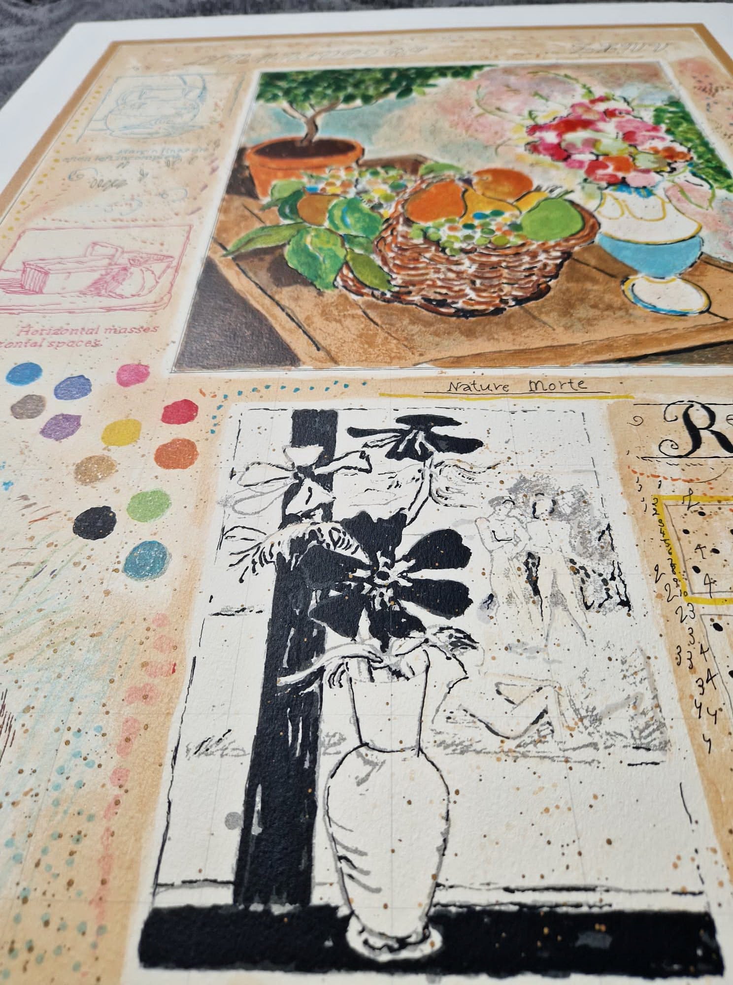 „Nature Morte“ (Zátišie) je sofistikovaná a intelektuálne bohatá originálna litografia od uznávaného izraelského majstra Michaela Eisemanna. Toto dielo, ktoré je súčasťou jeho ikonickej série „Stránky denníka“, je vizuálnou symfóniou, ktorá zachytáva umelcov intímny tvorivý proces.