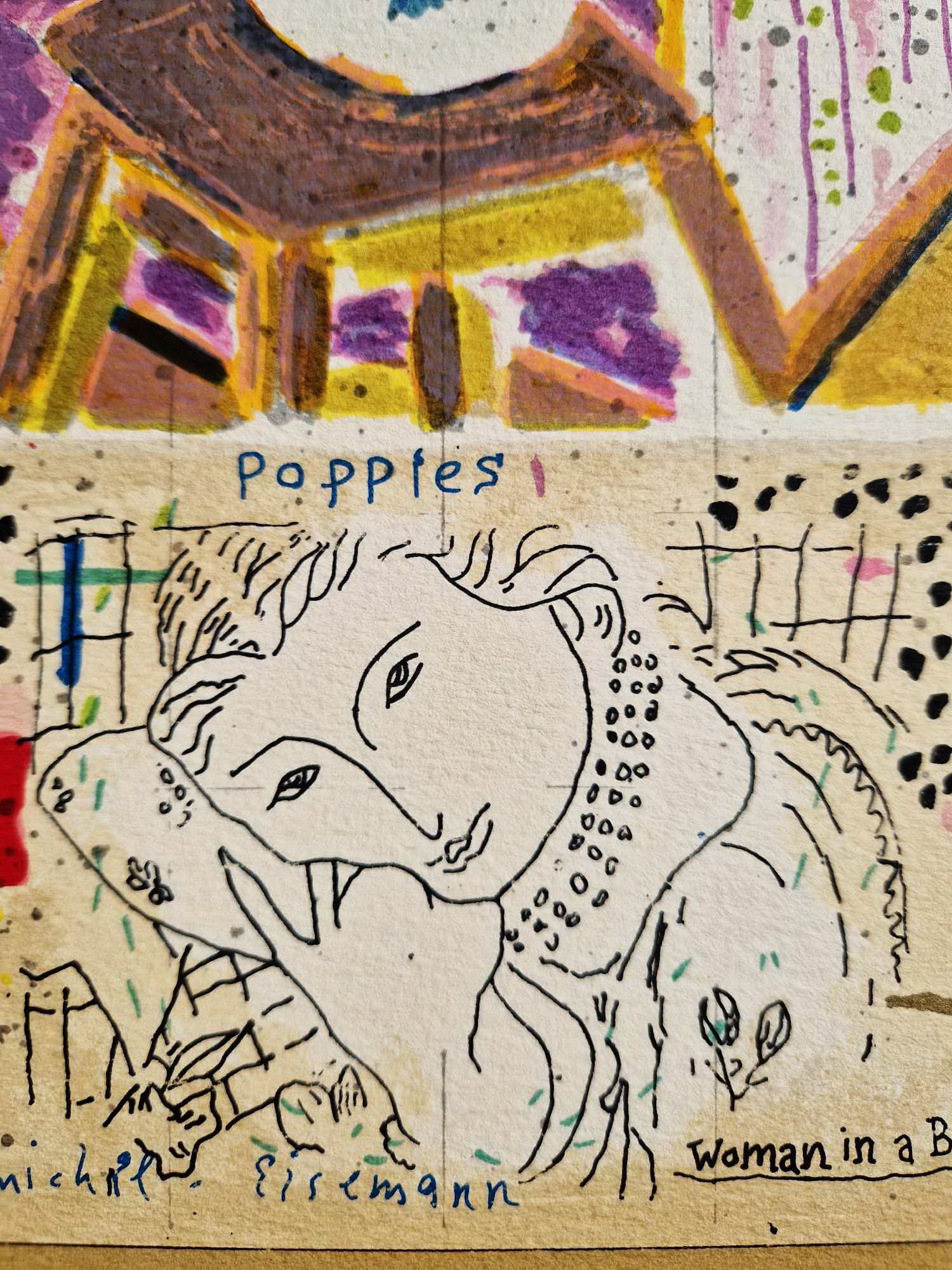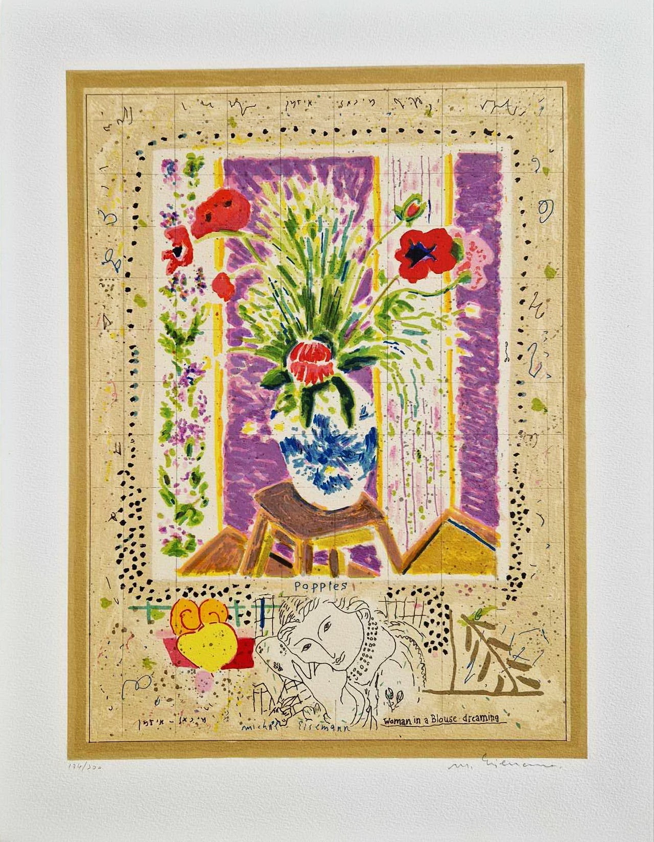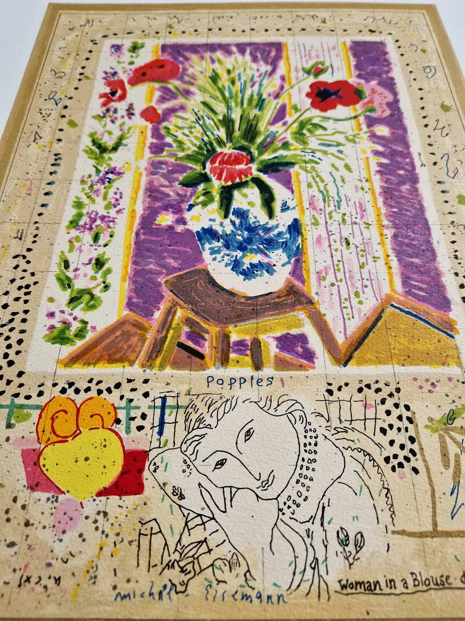 „Vlčie maky“ je fascinujúca a intelektuálne bohatá originálna litografia od uznávaného izraelského majstra Michaela Eisemanna. Toto dielo je úžasným príkladom jeho série „Stránky denníka“, kde preplieta viacero príbehov do jednej poetickej plochy.