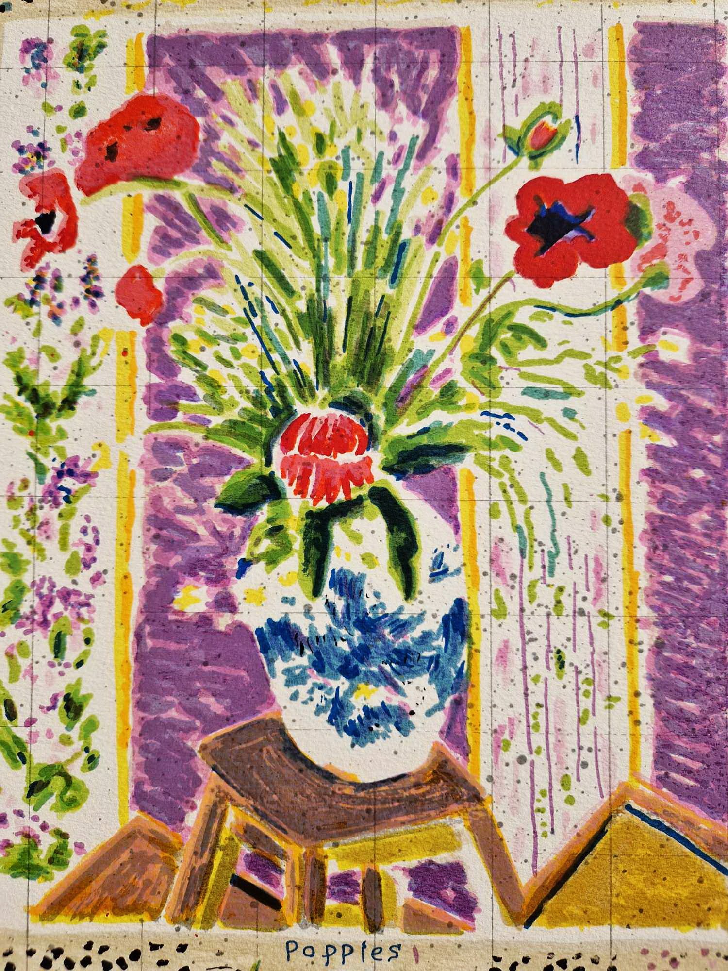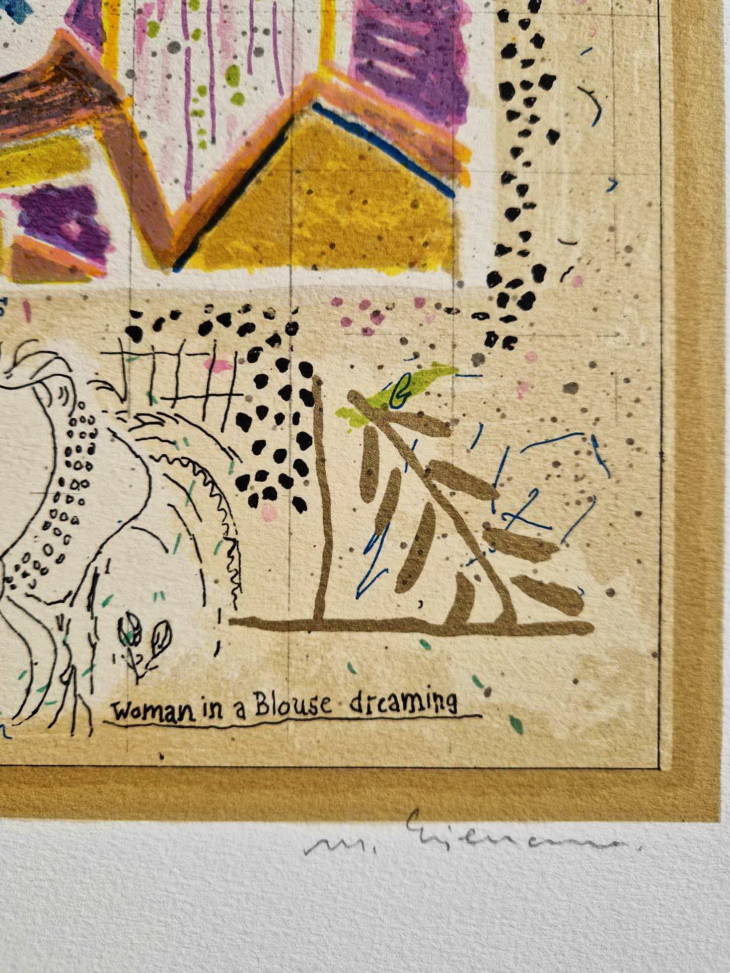 Kompozícia zachytáva žiarivú kyticu makov v klasickej modro-bielej porcelánovej váze, spolu s detailným portrétom ženy v blúzke, ktorá je opísaná ako „snívajúca“. Obklopená jemnými náčrtmi kvetov, vtákov a ručne písanými poznámkami, Eisemann vytvára snový (snový) vizuálny denník.
