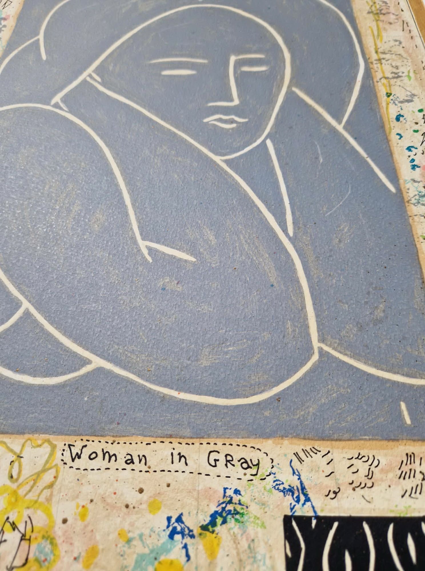 Kompozícia sa sústreďuje na tri odlišné ručne písané štúdie. Veľká, pokojná modrá silueta „Ženy v sivom“ dominuje hornému registru, zatiaľ čo jemné kvetinové ozdoby „Profilu s ružami“ a výrazná, grafická intenzita „Portrétu ženy“ vytvárajú sofistikovaný dialóg medzi farbou a líniou.