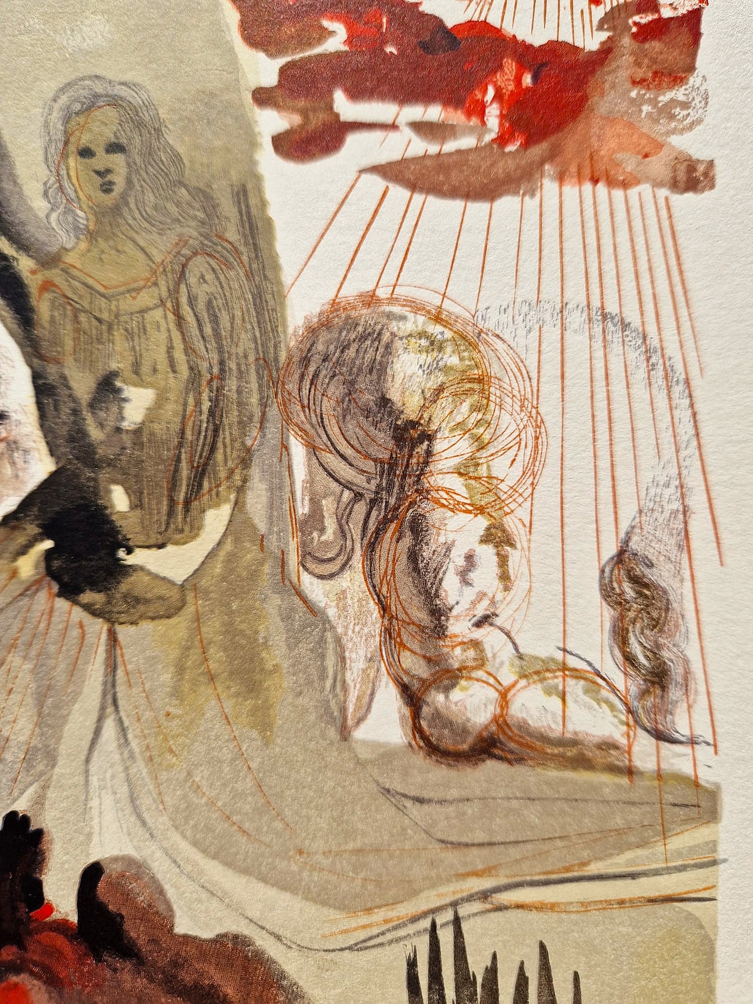 Originálna farebná drevorytina Salvadora Dalího zo série Božská komédia (Dante Alighieri), vytvorená medzi rokmi 1960 a 1964. Toto dielo je výsledkom monumentálneho projektu v spolupráci s parížskym vydavateľstvom Les Heures Claires . Každú ilustráciu starostlivo ručne vyryl majster rytec Raymond Jacquet , pričom na dosiahnutie bohatej farebnosti použil v priemere 35 samostatných drevených blokov na tlač. Zostáva jedným z najvýznamnejších grafických úspechov 20. storočia, ktorý spája Dalího surrealistickú víziu so stredovekou literárnou klasikou.